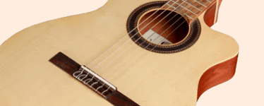 El puente se fabrica en ovangkol y este modelo monta un clavijero niquelado con clavijas blancas que afina a la perfección. La parte electroacústica añade versatilidad: el sistema de previo y pastilla integrado (Fishman Clásica II) proyecta un sonido natural y controlable (afinador, volumen, etc.) para ensayos, bolos pequeños o grabación directa.