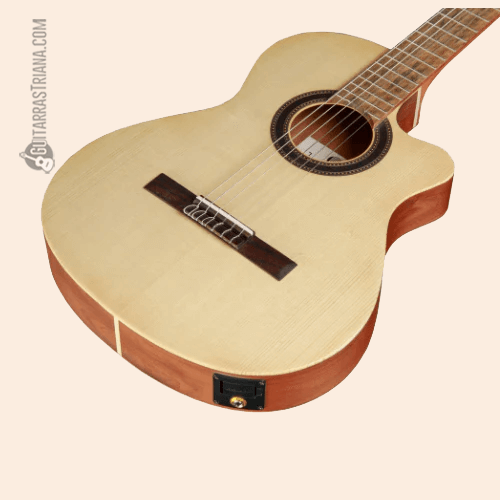 La construcción de esta guitarra electroclásica es ligera y el cutaway permite un fácil acceso a últimos trastes. Tras probarla, podemos afirmar que tiene un mástil agradable que invita a seguir tocando. Además, es una guitarra económica pero perfectamente acabada, pues Guitarras Alhambra cuida los detalles sea cual sea el precio del instrumento.