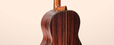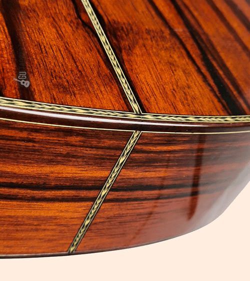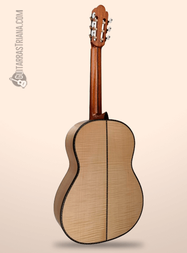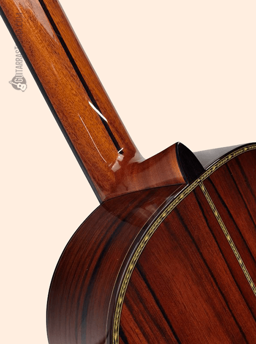 Para los aros y el fondo se utiliza palosanto de Patagonia (o arce rizado), una madera muy apreciada por su carácter redondo, su estabilidad y su llamativo veteado. Su timbre combina graves poderosos, medios equilibrados y agudos definidos, aportando una resonancia amplia ideal para repertorio solista y música de cámara. El mástil de cedro incorpora refuerzo de ébano y alma ajustable, a lo que se le une un diapasón de ébano de excelente calidad.