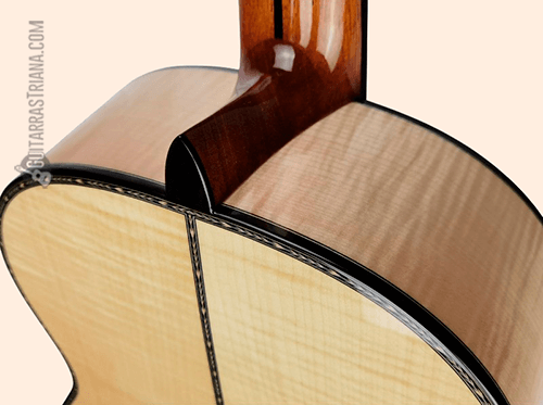 El proceso artesanal se cuidó al detalle, con ajustes de solera, selección manual de baretas y una supervisión directa del maestro en aspectos clave como alturas, diseño del mango y equilibrio general del instrumento. Uno de los mayores esfuerzos se dedicó precisamente al mástil: se exploraron perfiles, grosores y curvaturas hasta dar con una forma extraordinariamente cómoda, pensada para manos de distintos tamaños y, sobre todo, para permitir un estudio prolongado sin tensiones.