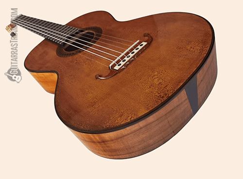 La selección de maderas para esta guitarra romántica ha sido cuidadosamente escogida por su belleza estética y propiedades acústicas. La tapa armónica está fabricada en pino abeto macizo, madera muy usada en este tipo de instrumentos. En contraste, el uso de arce rizado macizo en los aros y el fondo no solo aporta una calidad visualmente impresionante, sino que también enriquece las cualidades sonoras de la guitarra.