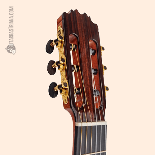 El mástil como no podía ser de otra manera, se fabrica en cedro. El diapasón de la guitarra está hecho de ébano, una madera densa que se caracteriza por su durabilidad y por poseer un tacto suave y cómodo para la pulsación. El clavijero mecánico Martínez (en dorado y negro), asegura una afinación precisa y estable, mientras que el puente de palosanto y los detalles decorativos, como el fileteado y la roseta, añaden un toque de elegancia y presencia.