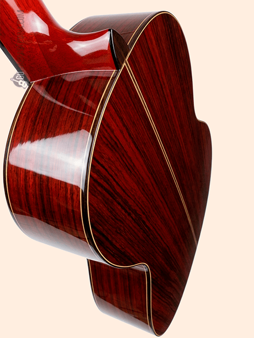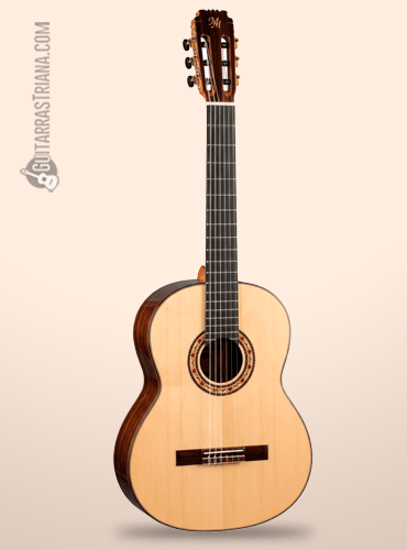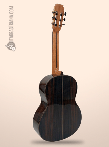 Ese aspecto tan atractivo que tiene es fruto del uso de algunas de las mejores maderas a las que tiene acceso Modesto Malla (catálogo de guitarras aquí), como es el caso de un palosanto de India seleccionado que hace de sus aros y fondo uno de los elementos fundamentales de la pieza. Gracias a esta madera mejora el timbre y destaca para que eleve su potencia por encima de lo que puedas imaginar.