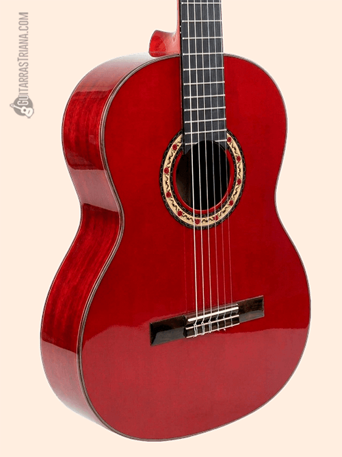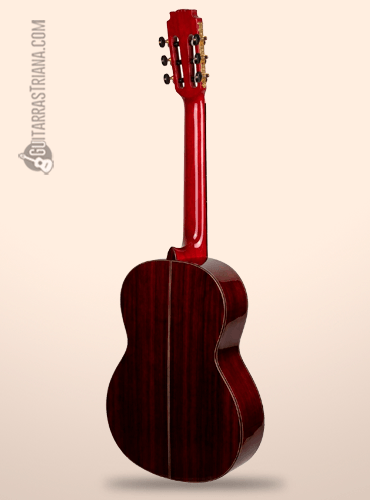 Para el diapasón, el richlite cobra protagonismo, madera muy similar al ébano tanto en dureza como en propiedades acústicas. Y para terminar, este aspecto tan flamenco se ve reforzado con un clavijero dorado con palomillas negras y un acabado en rojo brillo que atrae todas las miradas.