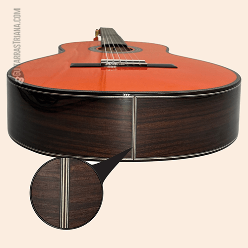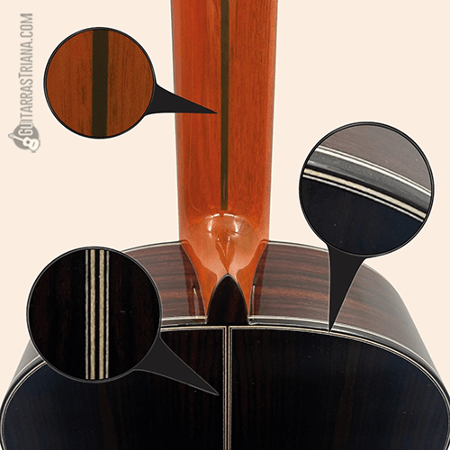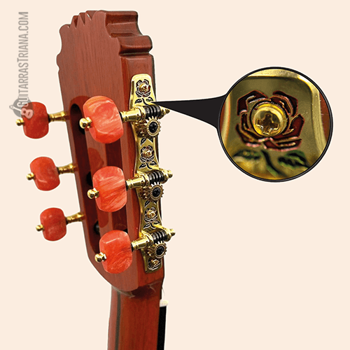 Posee unas maderas de lujo y unos acabados que destilan artesanía y buen gusto: perfiles y roseta a juego, puente de 12 agujeros y un clavijero chapado en oro con detalles de rosas.